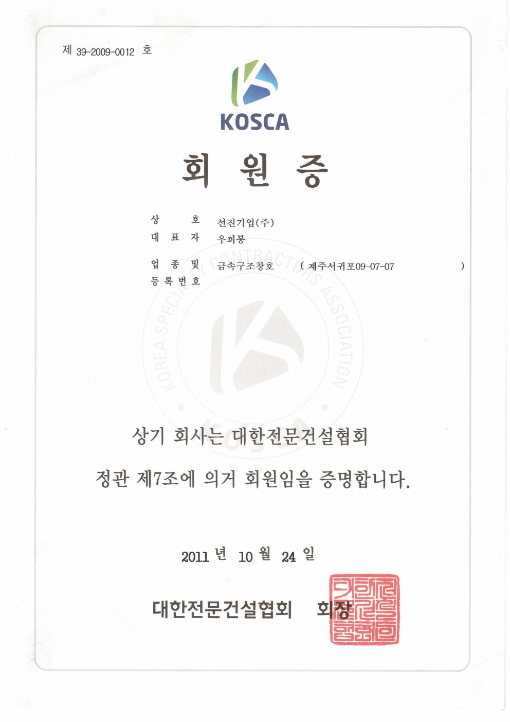 Membership card of the Korea Professional Construction Assoc…