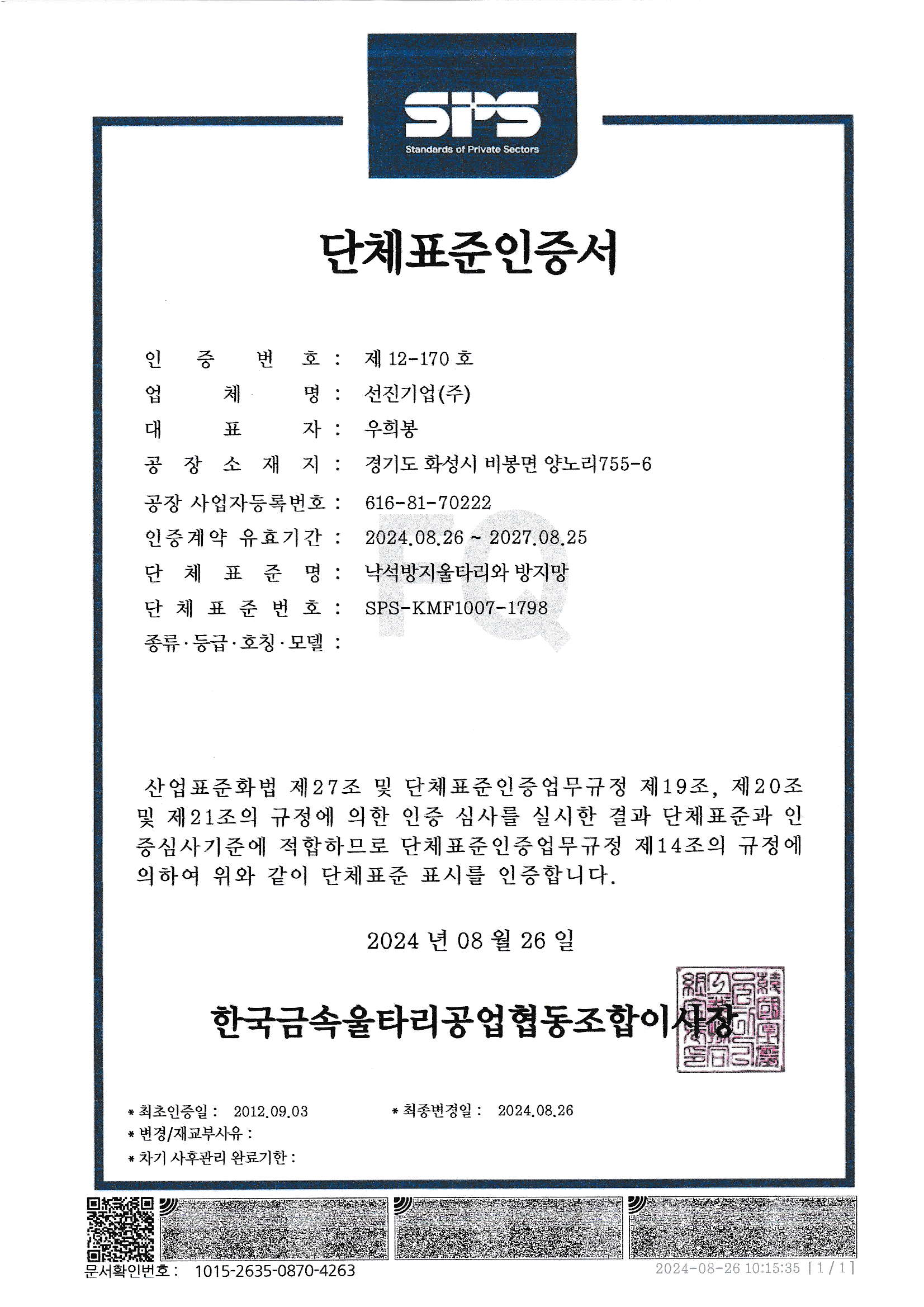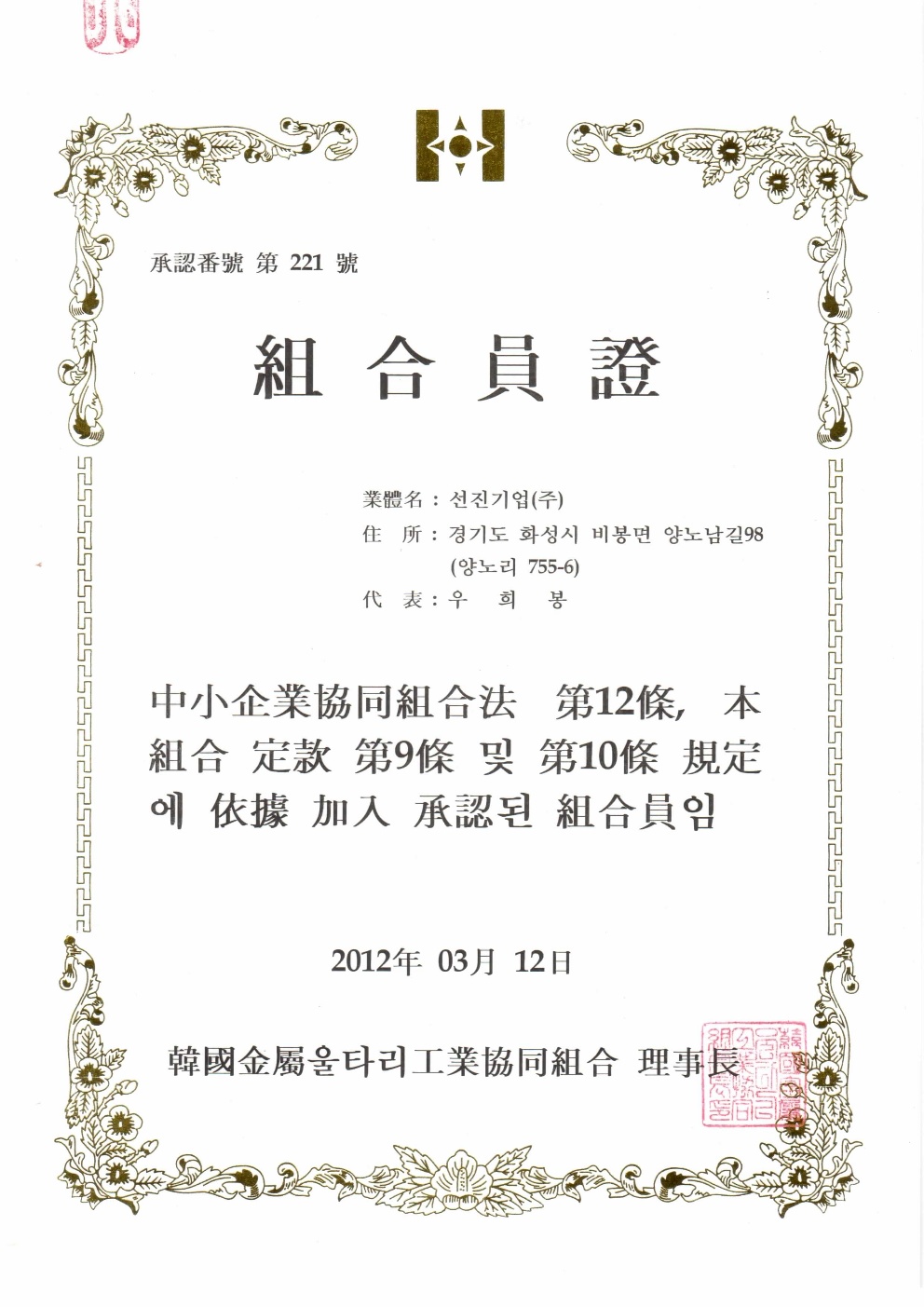 Membership certificate of the Korea Metal Barrier Associatio…
