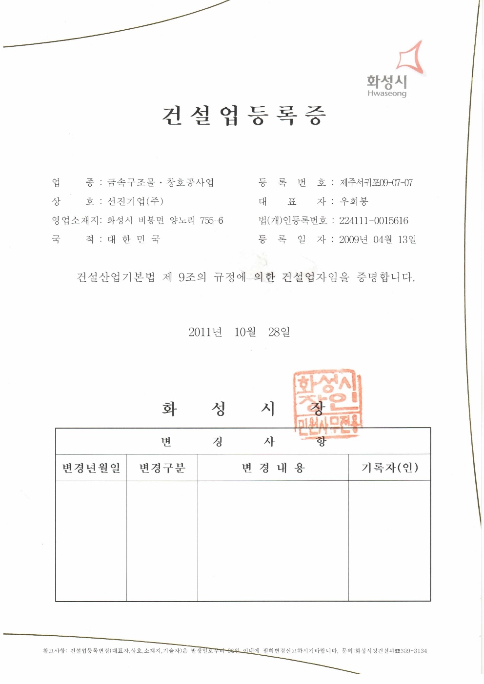 Construction business registration certificate